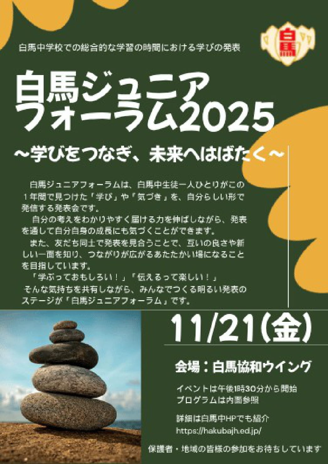 【11/21(金)】白馬ジュニアフォーラム2025~学びをつなぎ、未来へはばたく~が開催されます admin 2025年11月20日 【11/21(金)】白馬ジュニアフォーラム2025~学びをつなぎ、未来へはばたく~が開催されます2025-11-20T19:33:41+09:00 お知らせ 白馬ジュニアフォーラム2025~学びをつなぎ、未来へはばたく~が開催されます日付:11月21日(金)会場:白馬協和ウイング